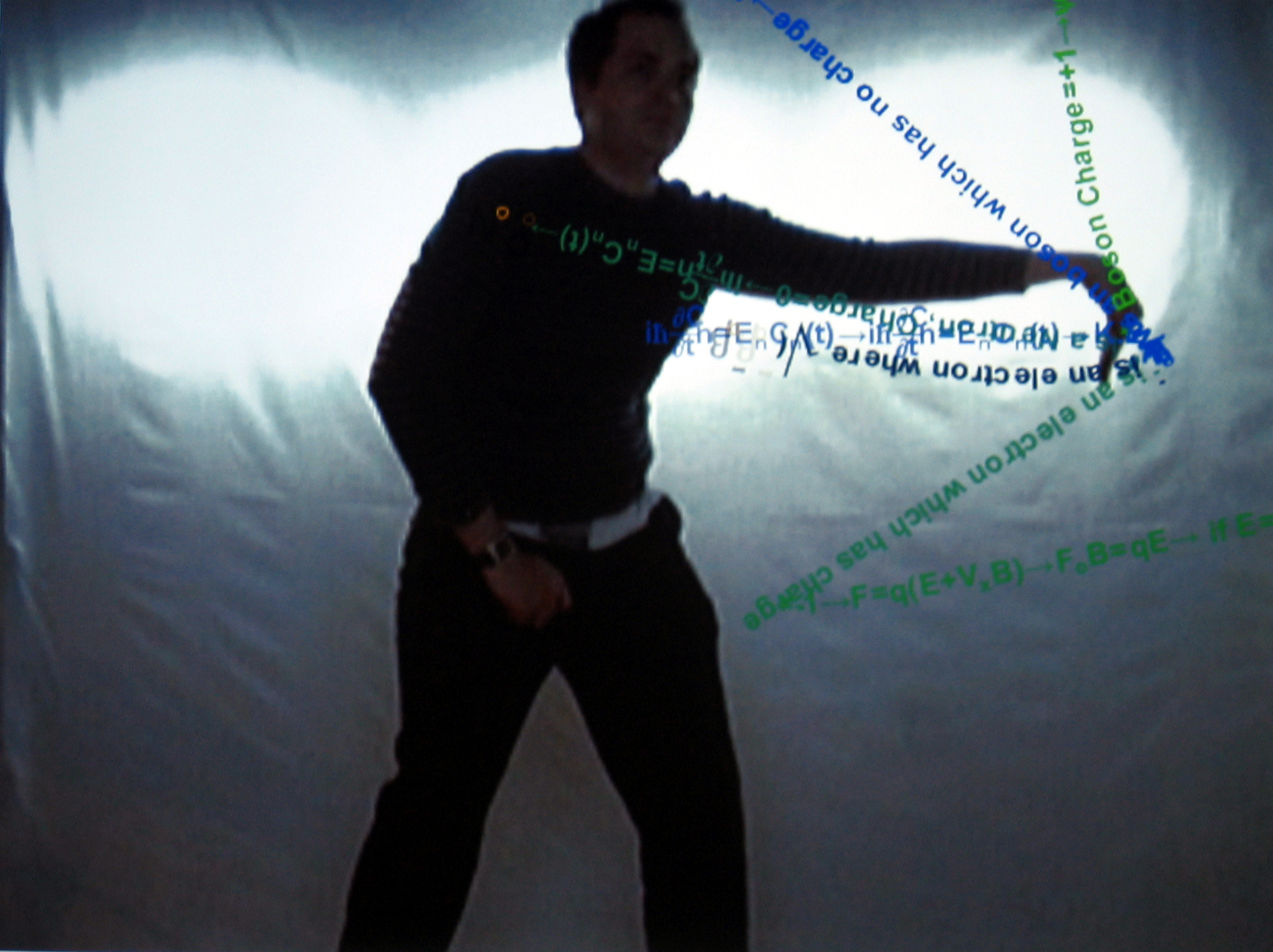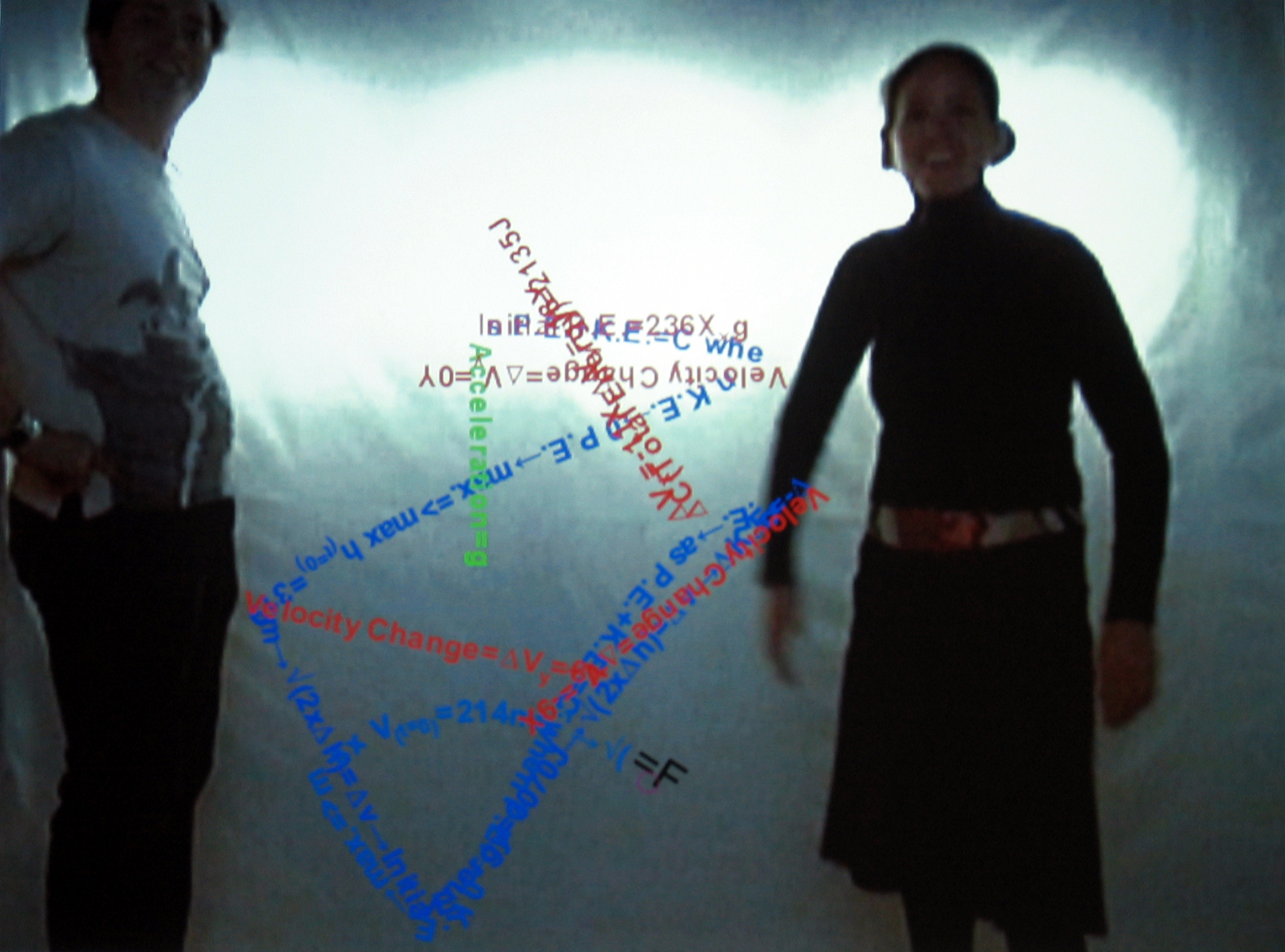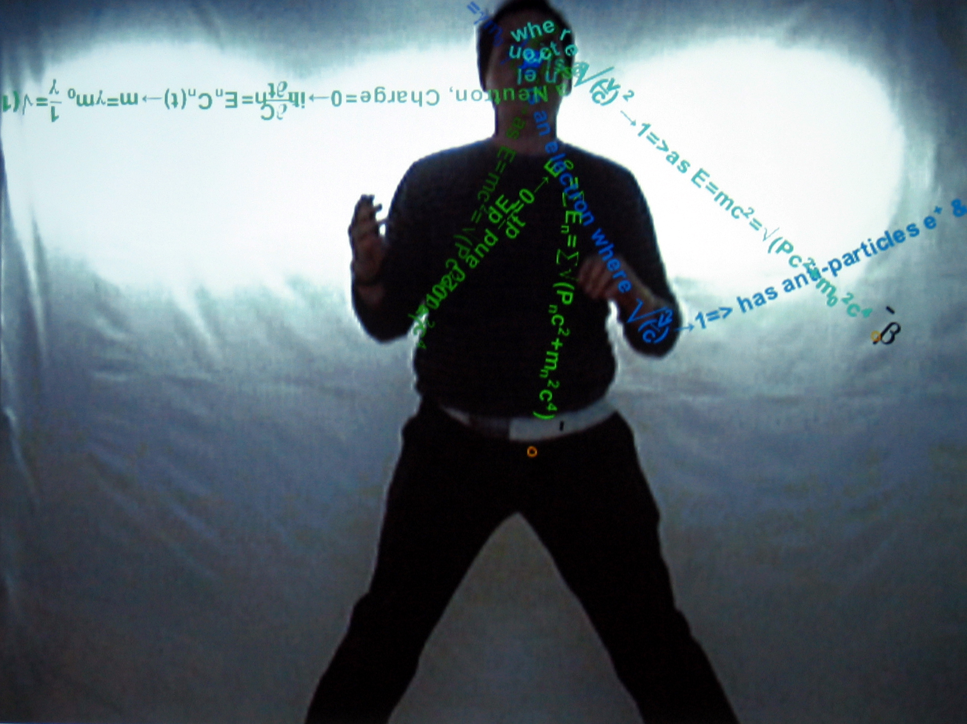 Users are projected onto a screen, gesture is captured and triggers moving (dynamic typographic) equations to be generated which move in a physically real manner. Once in motion these equations can be interacted with by the users.