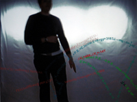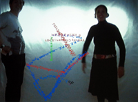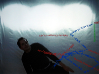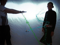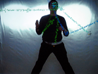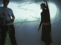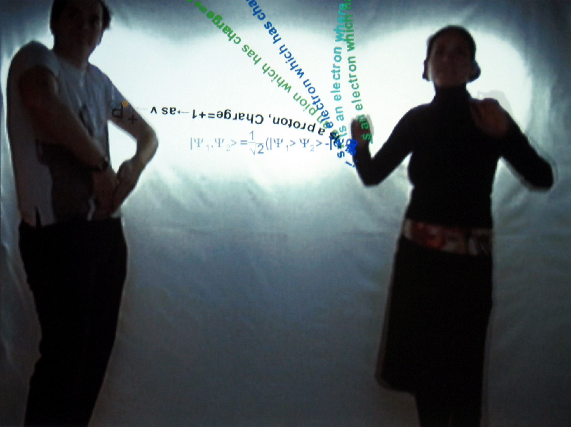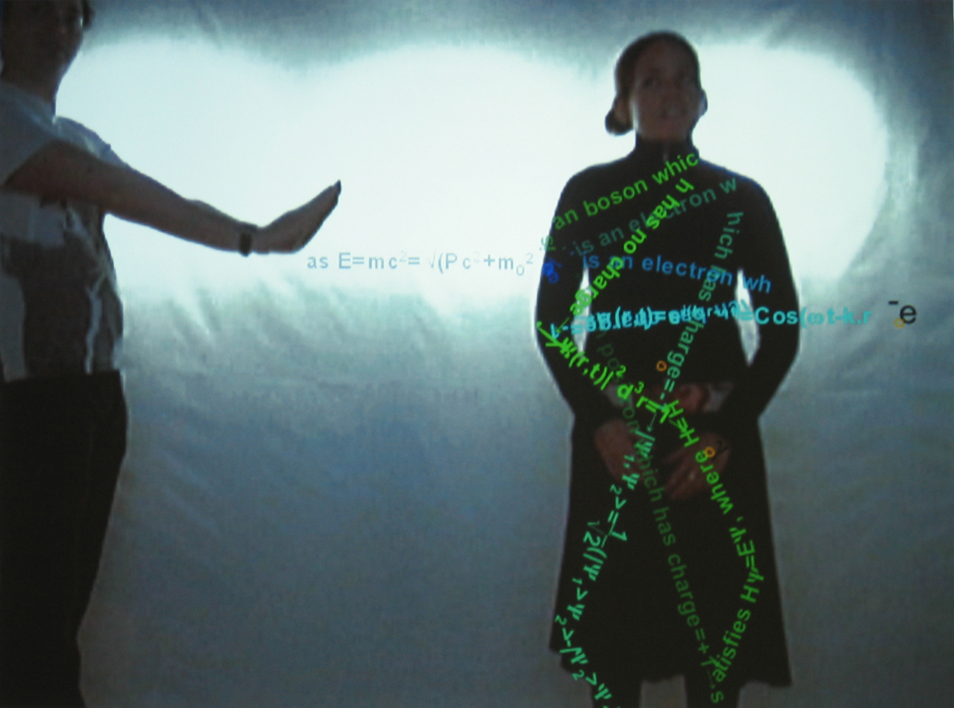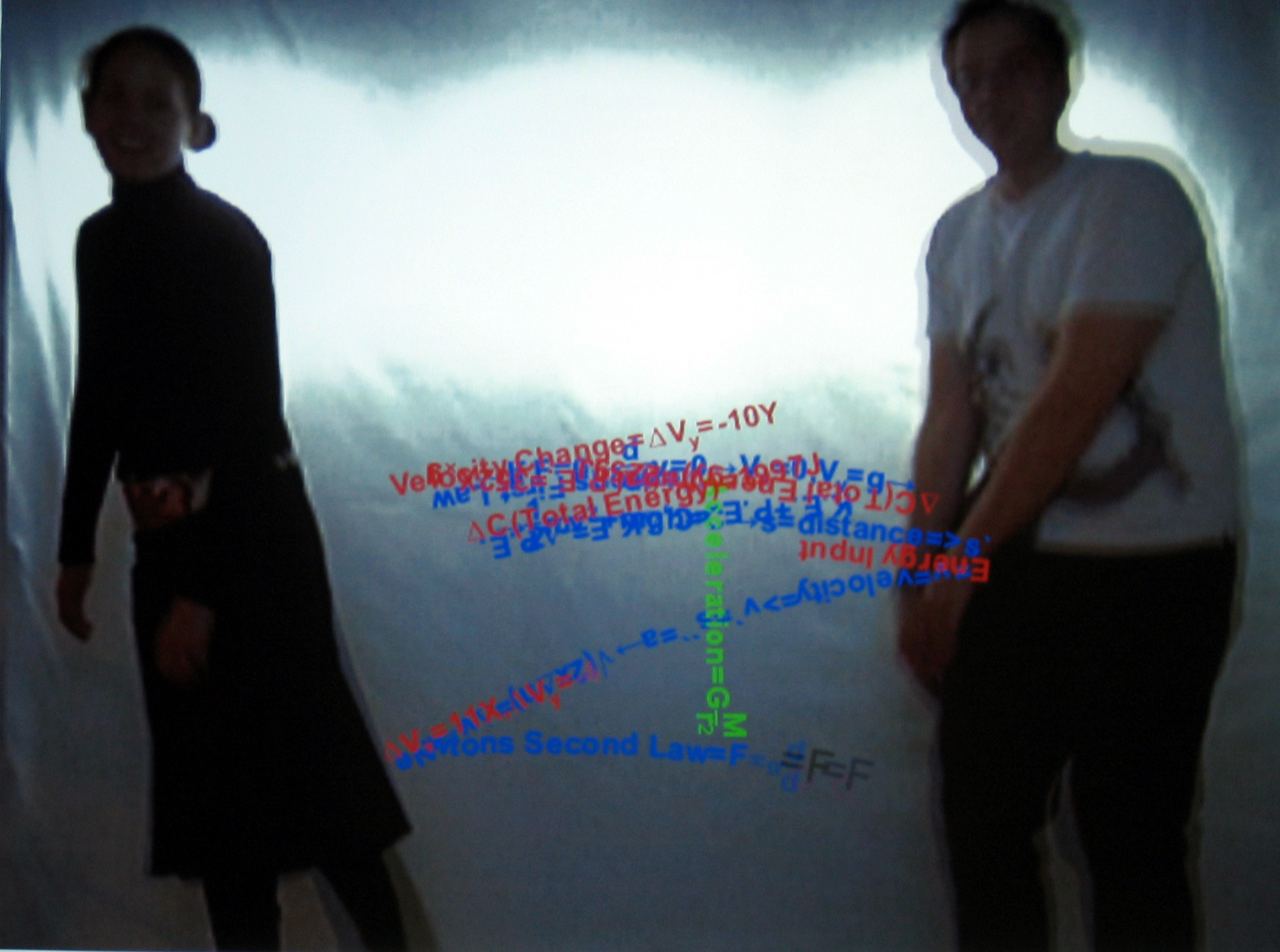 Users are projected onto a screen, gesture is captured and triggers moving (dynamic typographic) equations to be generated which move in a physically real manner. Once in motion these equations can be interacted with by the users.
